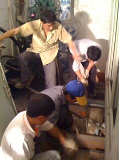 24日,西溪賓館工程部員工黃相信6點鐘就到了現(xiàn)場開展準備工作,6點半左右,施工單位人員也到了現(xiàn)場進行搶修。配電房地方小,沒有排風設(shè)備,天氣又十分悶熱,人站著不動都要出汗,更何況要把6個立方左右的金屬箱抬起來,擱在工字鋼上。汗水迅速浸透了全身,泥土和汗水混在每一位工人師傅的臉上、身上,但他們無暇顧及,只想著盡快完成搶修,只想著不要因此再延誤工期。工程部張師傅已年過60,但他照樣和年輕人一起沖在前面。經(jīng)過3個多小時的辛苦工作,配電箱終于又直立了起來,為電纜重接搶奪了寶貴的時間。
