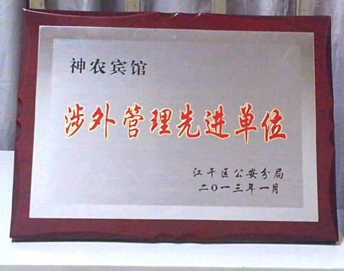 ? ? 2013年1月8日,江干區(qū)公安分局在杭州灣大酒店召開2012年度江干區(qū)涉外賓館單位和個人表彰大會。神農(nóng)賓館榮獲2012年度江干區(qū)“涉外管理先進單位”稱號,成為全區(qū)10家涉外接待管理先進單位之一。